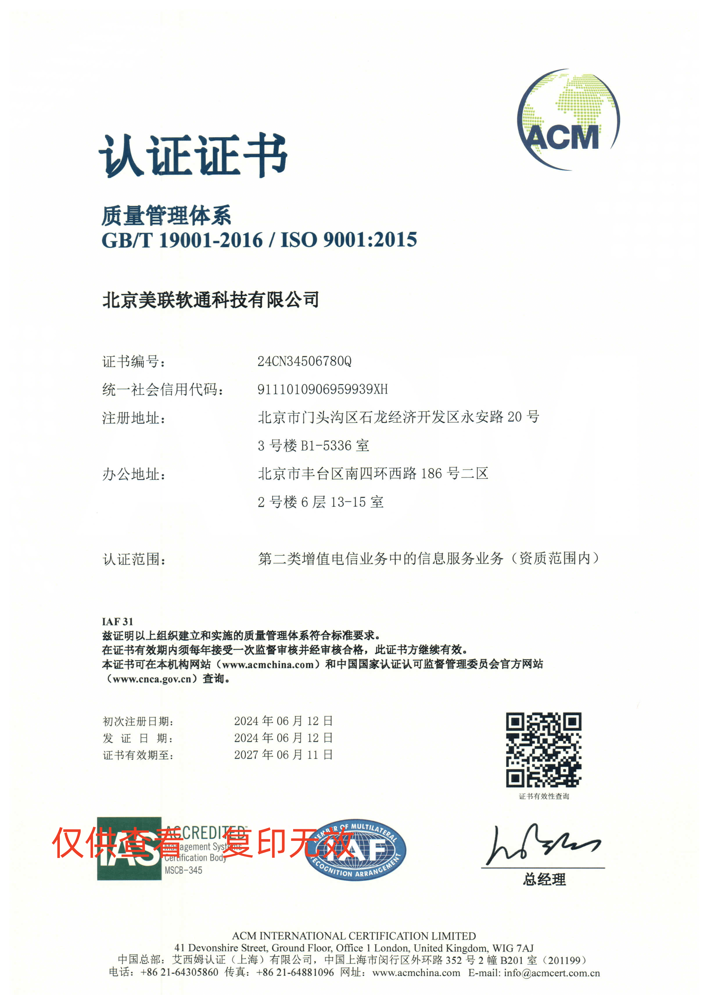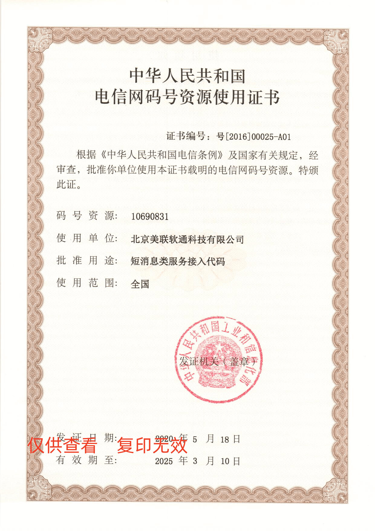 全国电信网码号证书: